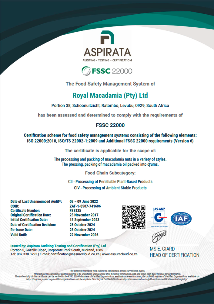Royal Macadamia is FSSC 22000 certified, demonstrating our adherence to global food safety management standards. This certification assures our customers that all our products, from macadamia nuts to oils, are processed in a safe, quality-controlled environment.