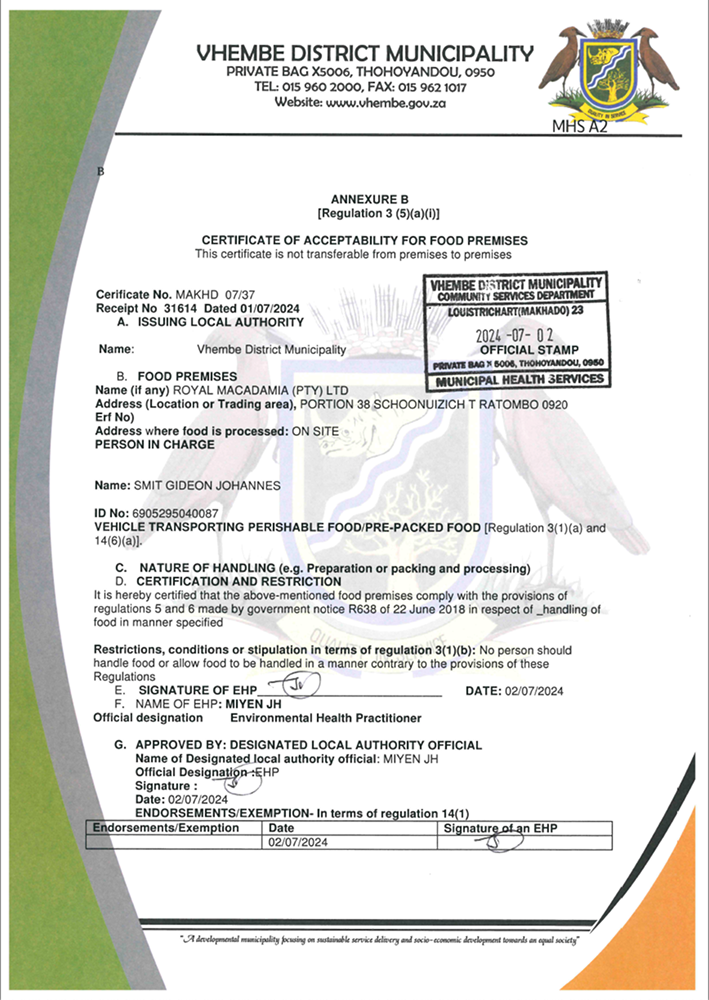 Royal Macadamia meets the standards set by the Vhembe District Municipality for food safety. This certificate ensures our manufacturing premises are approved for processing perishable and pre-packed food, maintaining the highest food safety standards.