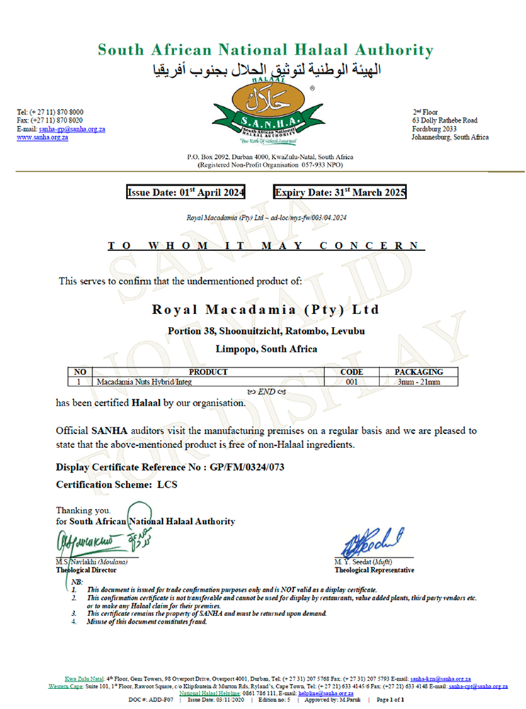 Our macadamia products have been certified Halaal, confirming that they meet the religious dietary requirements for Muslim consumers. We ensure that all our processes comply with the highest standards of Halaal food preparation and handling.