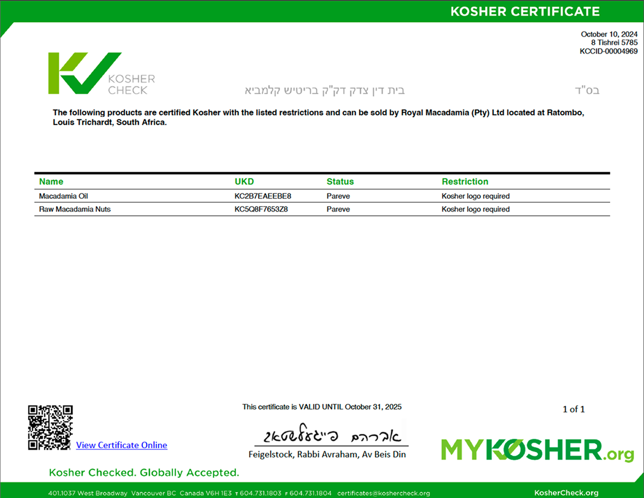 Royal Macadamia is proud to offer Kosher-certified products, ensuring our customers enjoy macadamia nuts and oils that meet the highest dietary standards. This certification guarantees that our products are suitable for all customers who follow kosher dietary laws.