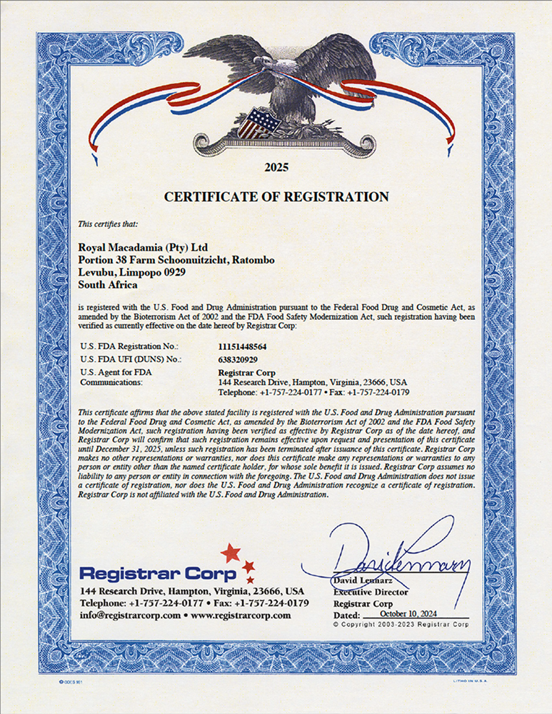 This certification affirms that Royal Macadamia’s products comply with U.S. Food and Drug Administration regulations. Our commitment to high standards ensures that every product is safe, quality-controlled, and trusted by consumers globally.